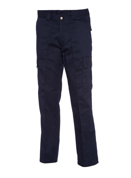 Washable at 60 Degrees 65% Polyester 35% Cotton Flat front with sewn-in front crease Twin hook & bar fastening at waist Twin belt loops reinforced for extra strength Wide belt loops 2 side & 2 rear pockets with velcro flaps 2 thigh pockets with velcro flaps Fabric: 245 GSM/7 oz Concealed Metal rivet button fastening at waist